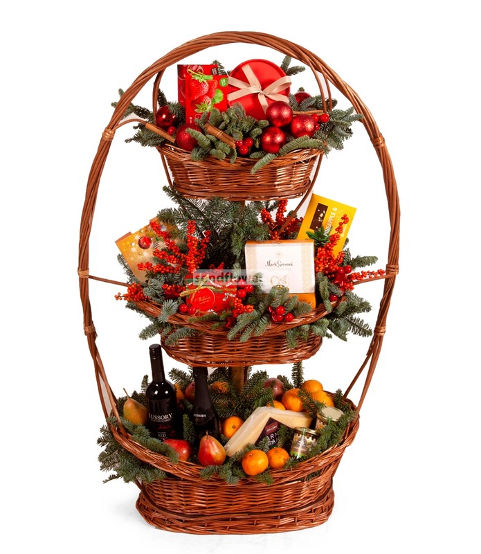 Состав: Оазис кирпич (15), Яблоки (5), Лапник (8), Мандарины (10), Груша (4), Лента натуральная (10), Шар новогодний стандартный (пластик) (5), Корица (8), Грейпфрут (4), Апельсин (4), Звезды, ёлочки декор на вставке (блест.) (7), Илекс желтый (3), Орехи в меду "Столбушинские" Кешью 160 г. стекло (1), Орехи в меду "Столбушинские" Грецкий 160 г. стекло (1), Сыр "Пармезан" (1), Шоколадный набор "Апельсиновая цедра в шоколаде" (1), Вино безалкогольное красное, 0,75 л (1), Вино игристое безалкогольное белое, 0,75 л (1), Шарик на вставке (20), Корзина трехуровневая из лозы (1), Молочный шоколад "Флер-Де-Лис" с натуральной клубникой и хрустящим безе, 100гр (1), Тёмный шоколад "Флер-Де-Лис" с посыпкой из дробленного кешью и кус. сублимированной ежевики, 100гр (1), Тёмный шоколад "Флер-Де-Лис" с лепестками миндаля и бисквитной крошки, 100гр (1), Шоколадные конфеты с малиновой начинкой в жестяной коробке 72гр (2806 FLORS FRAMBUESA) (1), Дольки апельсина в шоколаде 150г (CHOCONARANJA GRANEL) (1), hUAMEI Датское печенье (MERRY CHRISTMAS) Ж/Б 340г (1)