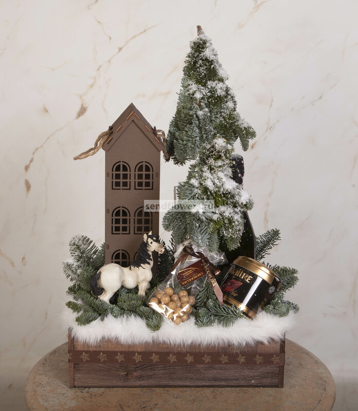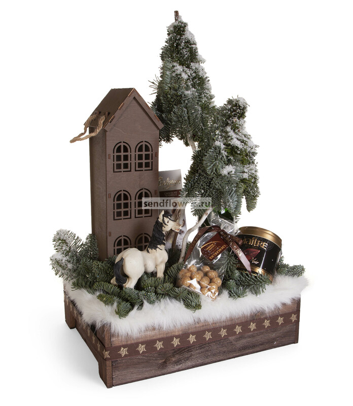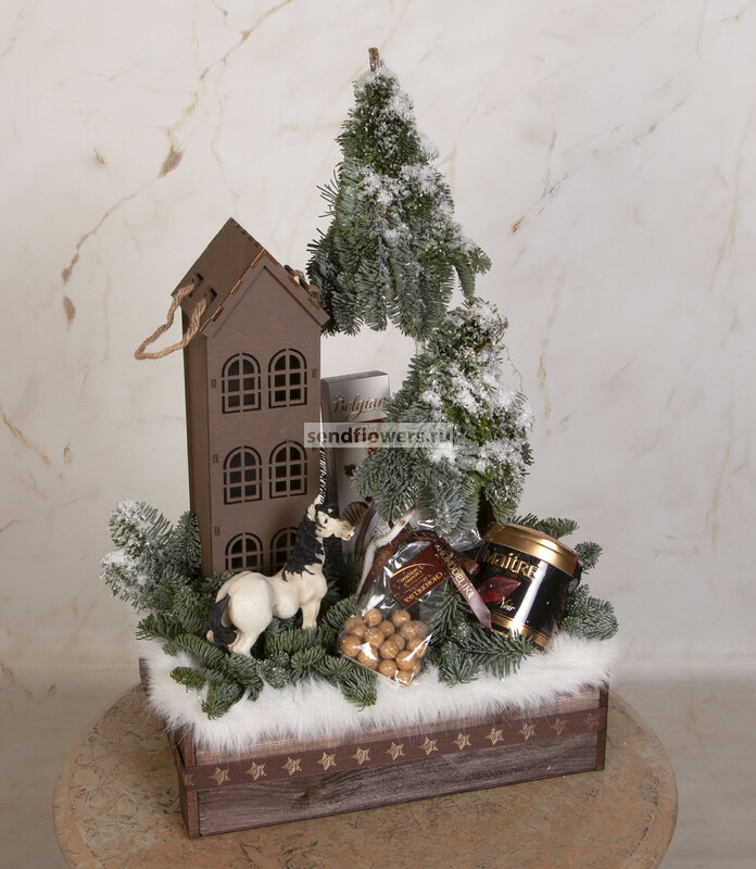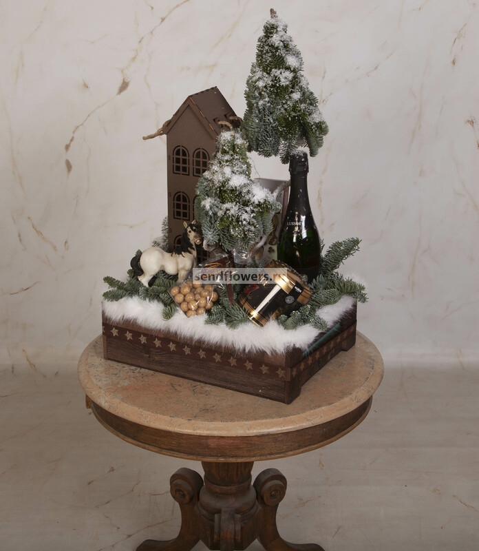 Состав: Оазис кирпич (6), Корилус (1), Лапник (4), Лента натуральная (10), Чай в жестяной банке (1), Снег искусственный (5), Шишки декор на вставке в ассорт. (блест/заснеж.) (24), Ящик 30х40 (дерево), состаренный (1), Шок.конфеты The Belgian с ароматом кофе 60г (1), Вино игристое безалкогольное белое, 0,75 л (1), Драже "Фундук и кофе", 100 гр. (1), Декоративный ящик для вина, Голландский домик, 39*11*10 см (1), Фигурный шоколад "Бутылка шампанского" 360гр (1), Искусственный мех сибирской норки (1), hS-7673-XB Фигура Лошадь 'Миледи' (Sealmark) (1)