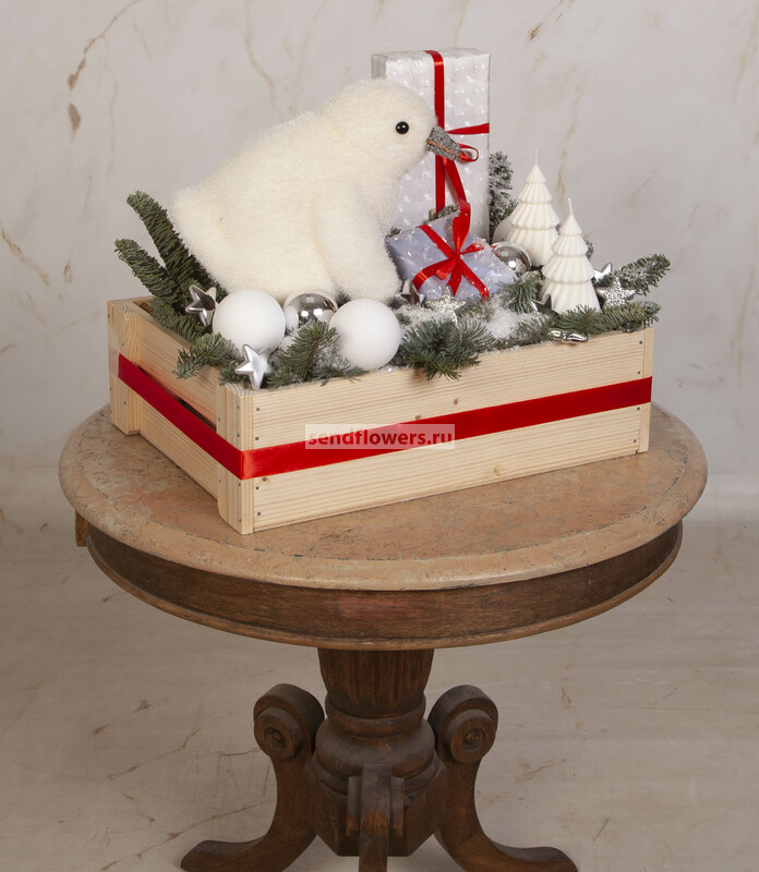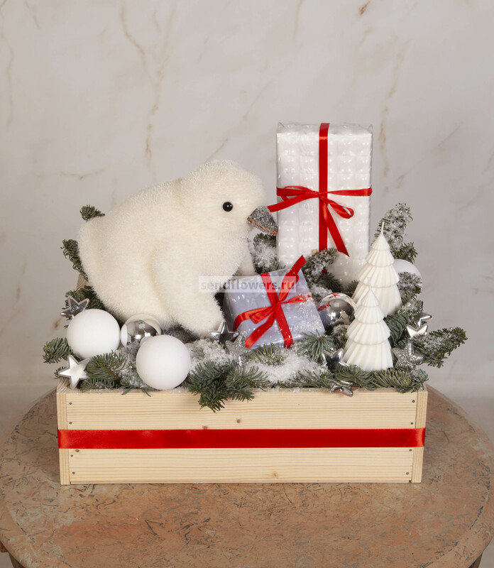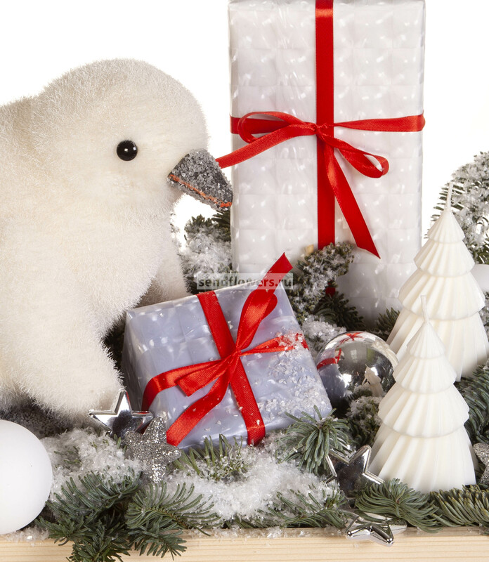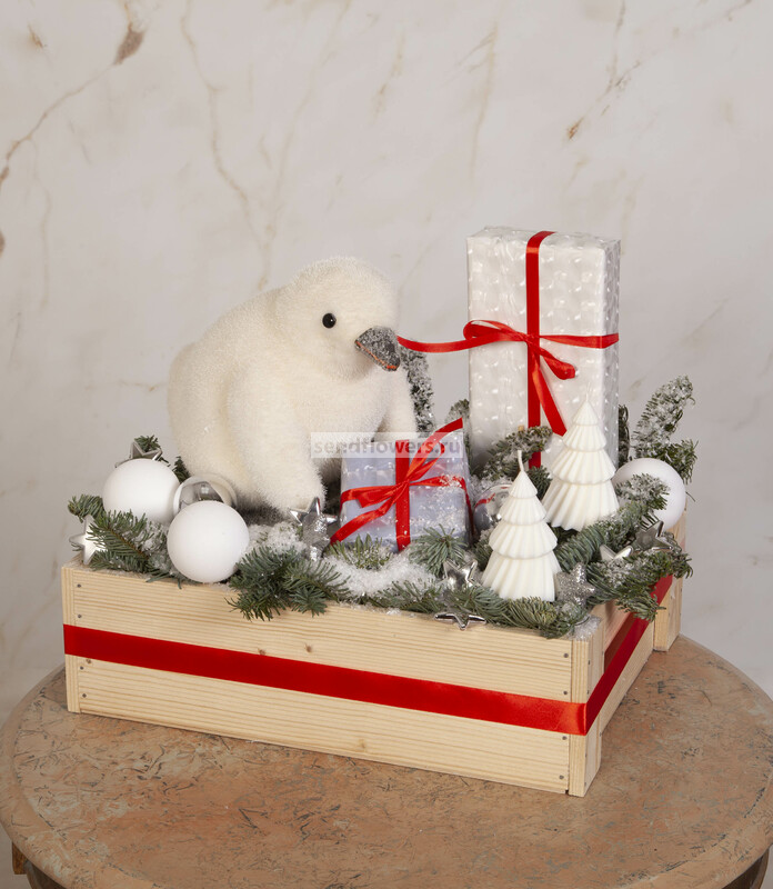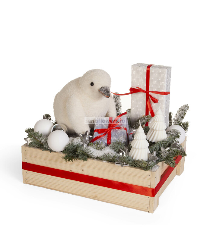 Состав: Оазис кирпич (5), Лапник (3), Лента натуральная (10), Шар новогодний стандартный (пластик) (7), Снег искусственный (2), Игрушка новогодняя "Пингвин" (1), Звезды, ёлочки декор на вставке (блест.) (10), Пленка матовая (3), ФРАНЦУЗСКИЕ ТРЮФЕЛИ "BARON" со вкусом чили 100гр. (1), Ящик 30х40 (дерево), цвет натуральный (1), ПОДСТАВКА ПОД ЛОЖКУ КОЛЛЕКЦИЯ "CHRISTMAS GIFT" 25.6X10.7X3.3 СМ (1), Декоративная свеча "Ёлочка" (2)