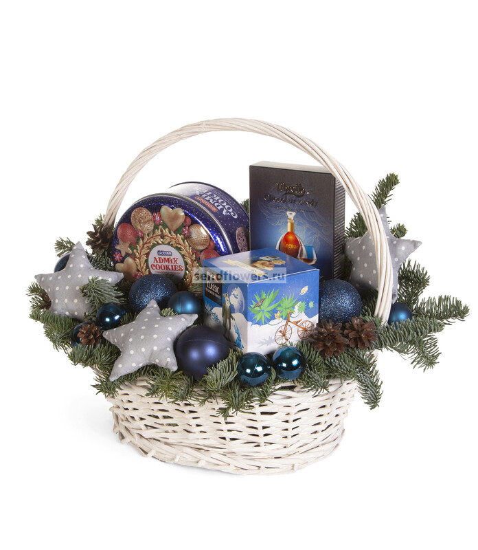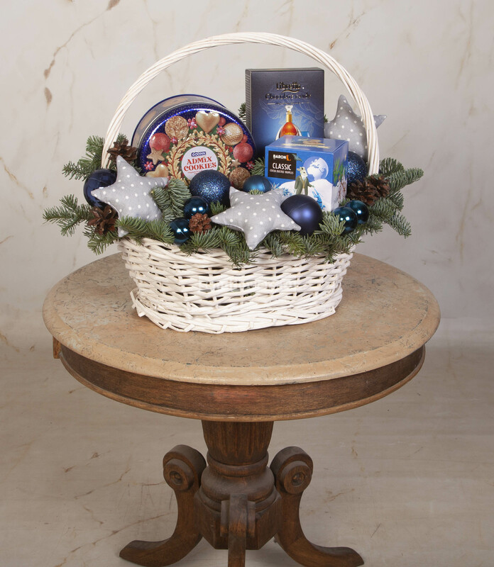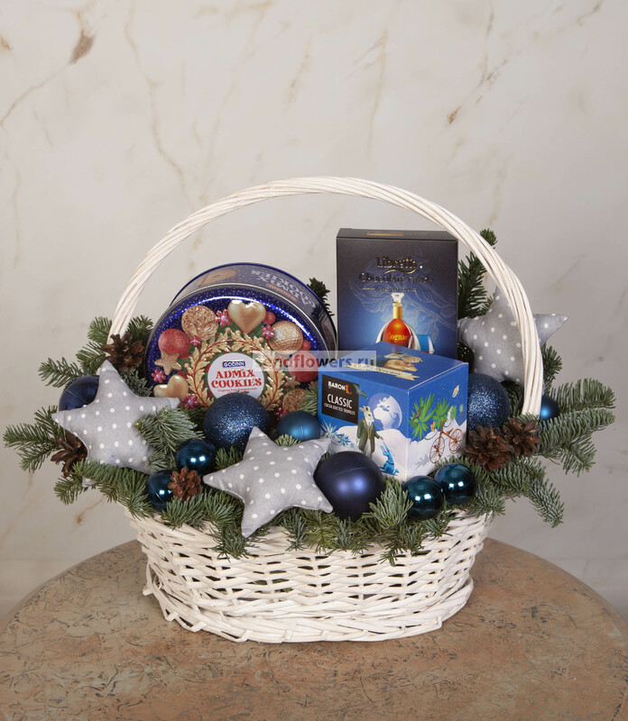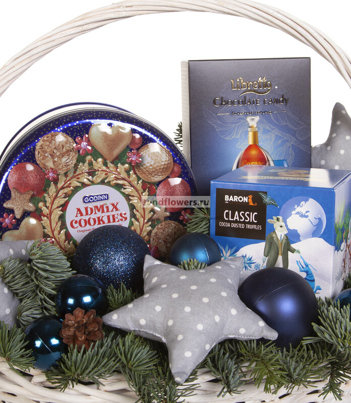 Состав: Оазис кирпич (2), Корзина малая (1), Лапник (2), Лента натуральная (5), Шар новогодний стандартный (пластик) (5), Шарики-мини (пластик) (7), Шишка натуральная (5), ФРАНЦУЗСКИЕ ТРЮФЕЛИ "BARON" классические 150гр. (1), Конфеты LIBRETTO в темном шоколаде с Коньячной начинкой 144г (1), Шитая игрушка "Звёздочка" (серая) (3), godinn Ассорти сдобного печенья (новогодняя ж/б) 178г (1)