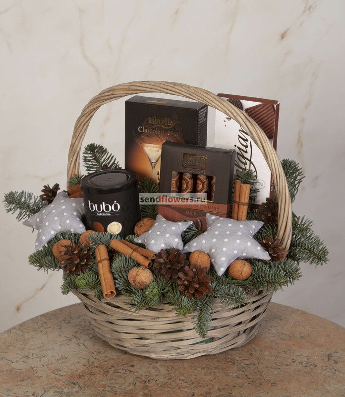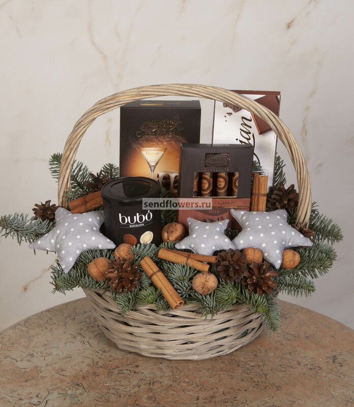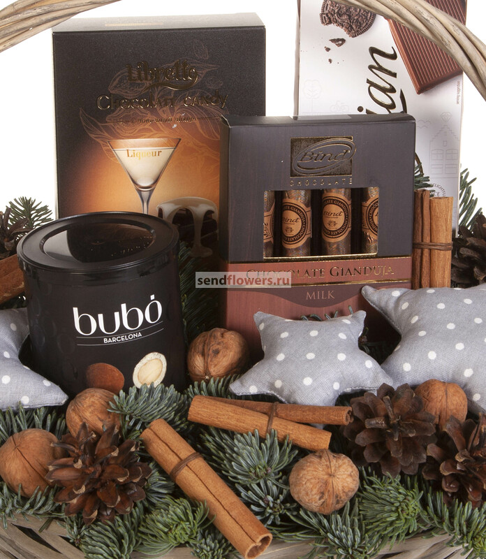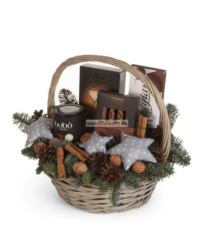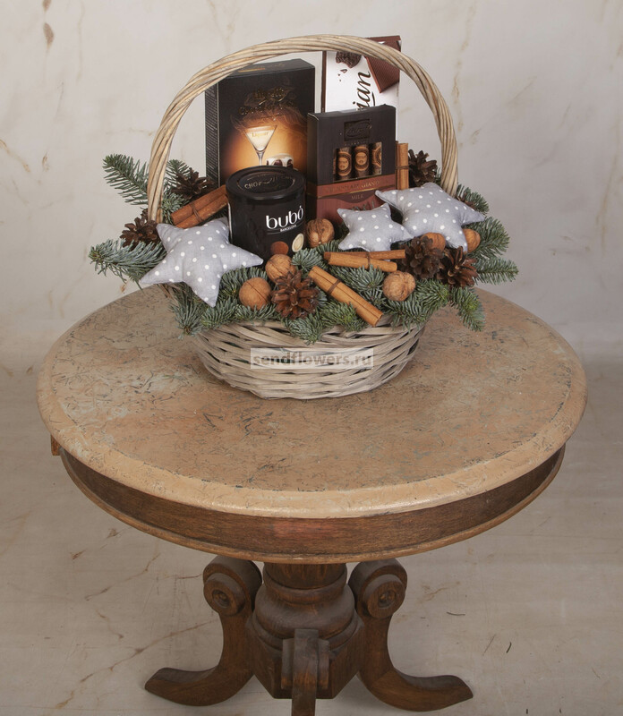 Состав: Оазис кирпич (2), Корзина малая (1), Лапник (2), Лента натуральная (5), Шишка натуральная (5), Корица (5), Грецкий орех (7), Молочный шоколад Belgian с хрустящим печеньем 100гр (1), Шоколад BIND "СИГАРА" с пралине (4шт*25г) 100г (1), Орех в шоколаде и какао пудре "BUBO" 190гр (1), Конфеты LIBRETTO в темном шоколаде со Сливочным ликером 144г (1), Шитая игрушка "Звёздочка" (серая) (3)