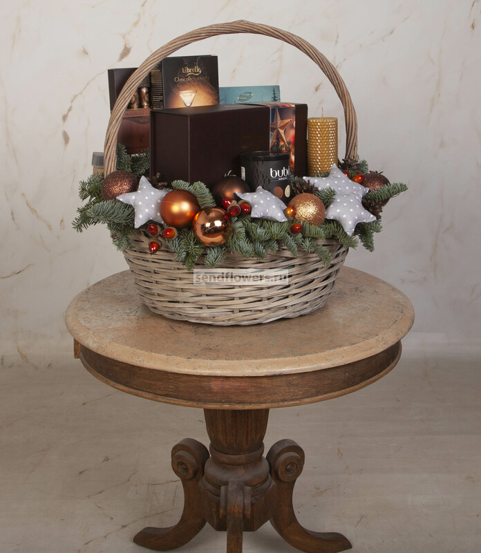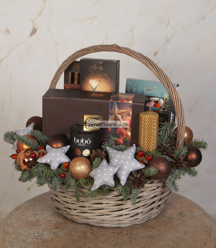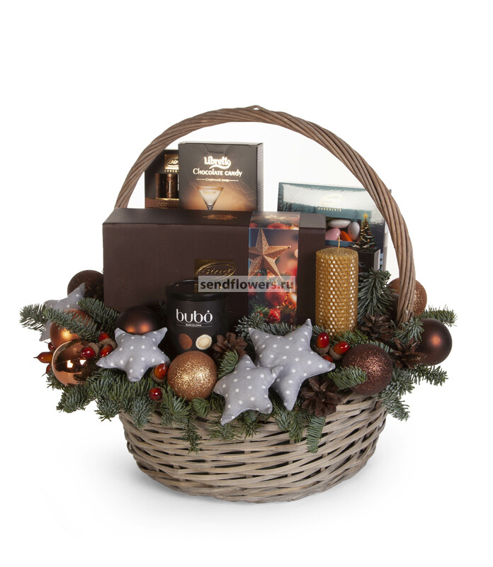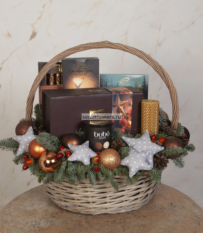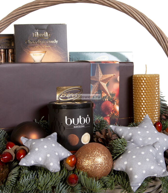 Состав: Оазис кирпич (8), Лапник (3), Лента натуральная (5), Шар новогодний стандартный (пластик) (9), Шишка натуральная (5), Корзина большая (1), Желудь на вставке (12), Шоколадное драже "Радуга микс" (1), Набор шоколадных конфет "Шкатулка" (1), Медовая свеча средняя (1), Шоколад BIND "СИГАРА" с пралине (4шт*25г) 100г (1), Шоколадное драже "Перепелиные яйца", 100гр (1), ФИГУРКА "ТИГРЕНОК" 8,5*5*8 (1), Конфеты LIBRETTO в темном шоколаде со Сливочным ликером 144г (1), Шитая игрушка "Звёздочка" (серая) (4), Свеча "Снежинка" (1)