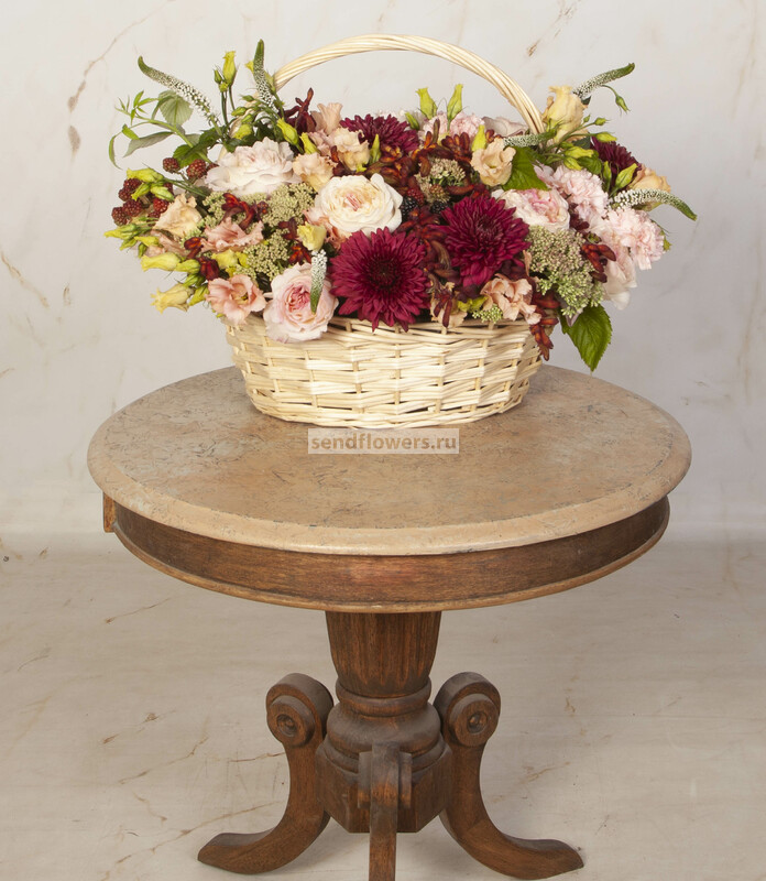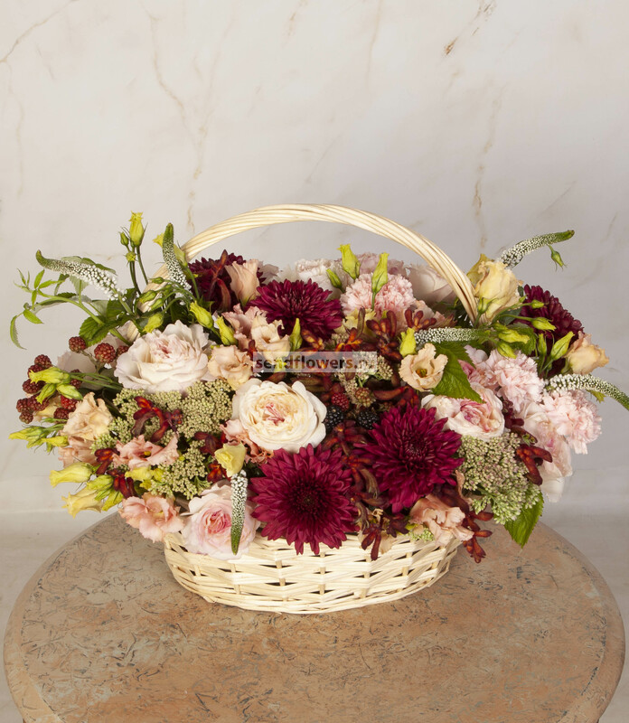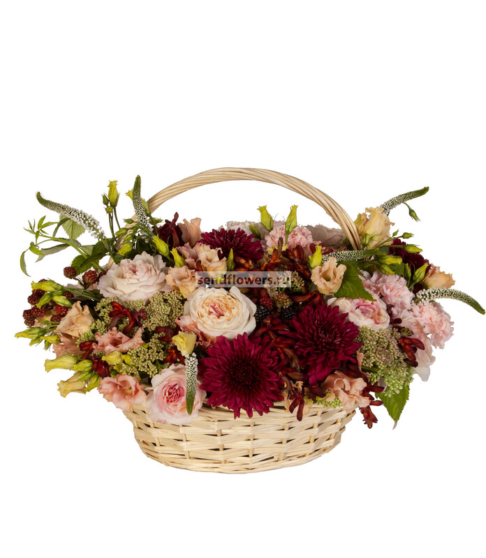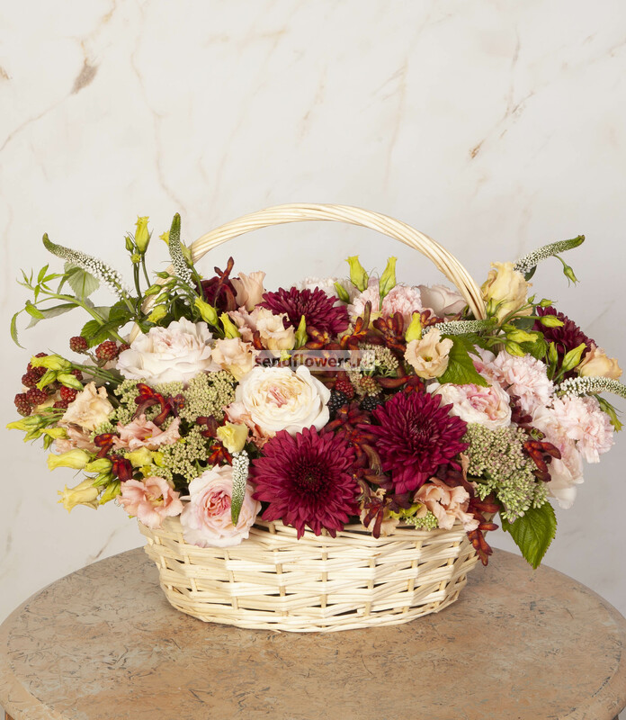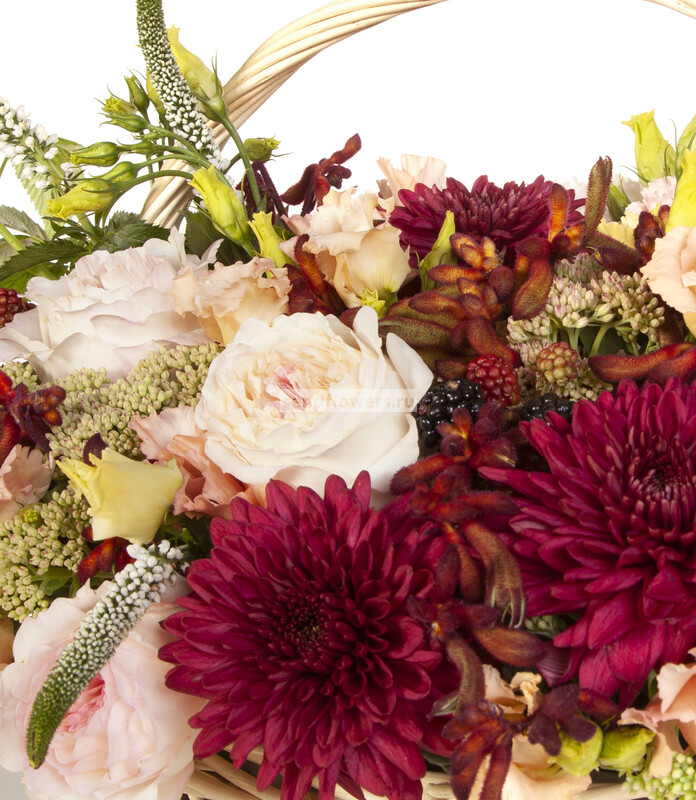 Состав: Корзина большая (1), Оазис кирпич (6), Анигозантус (7), Ежевика (5), Роза David Austin Keira (розовая) (16), Гвоздика розовая (7), Вероника белая (9), Эустома кремовая (7), Седум зеленый (7), Хризантема одноголовая Barca Red (7), Листья малины (3)