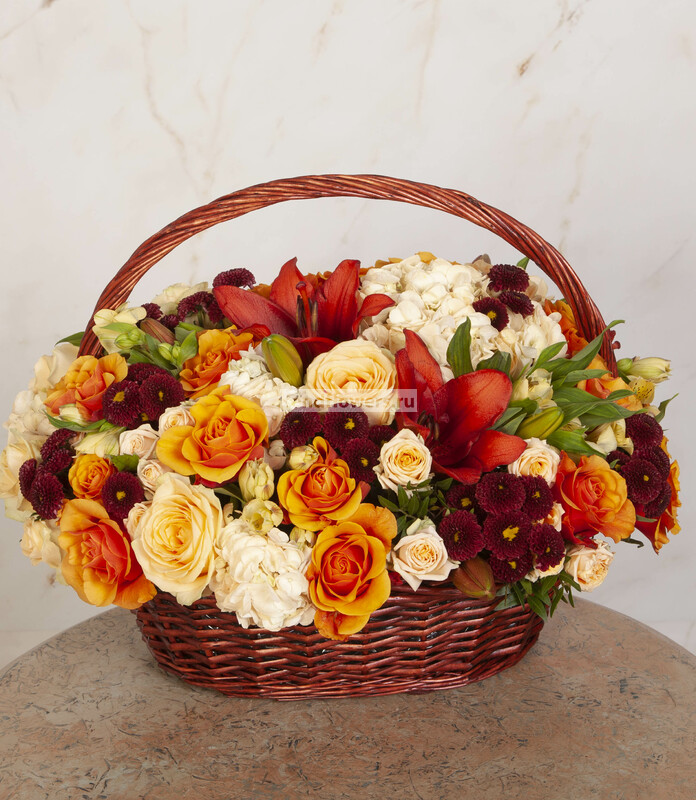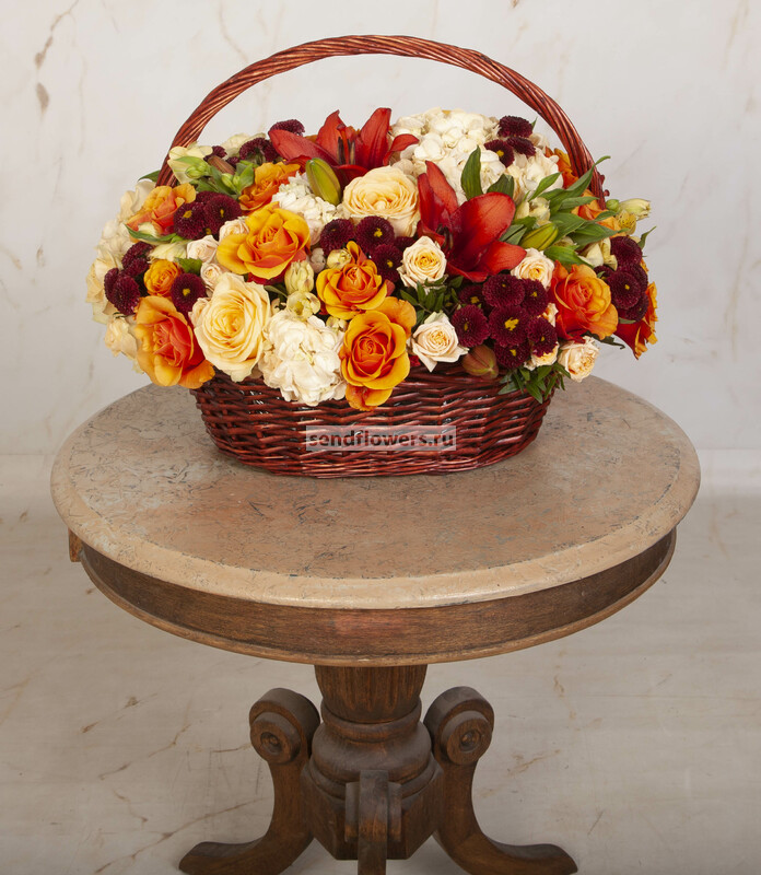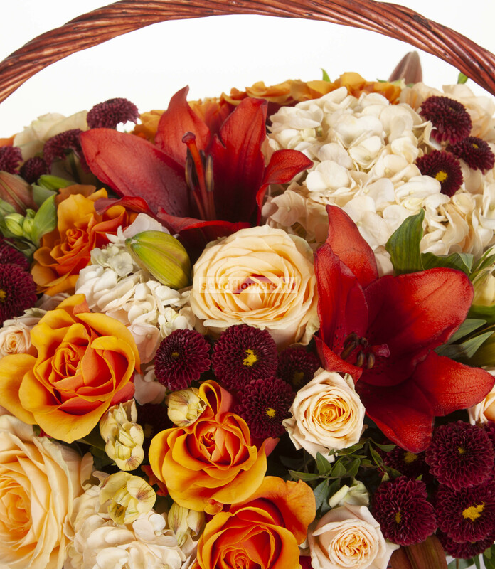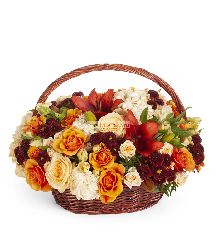 Состав: Корзина средняя (1), Оазис кирпич (4), Роза Espana (15), Фисташка (7), Альстромерия желтая (10), Роза кустовая кремовая (10), Роза кремовая (10), Лилия азиатская красная (4), Хризантема Сантини красная (9), Гортензия кремовая СО (2)