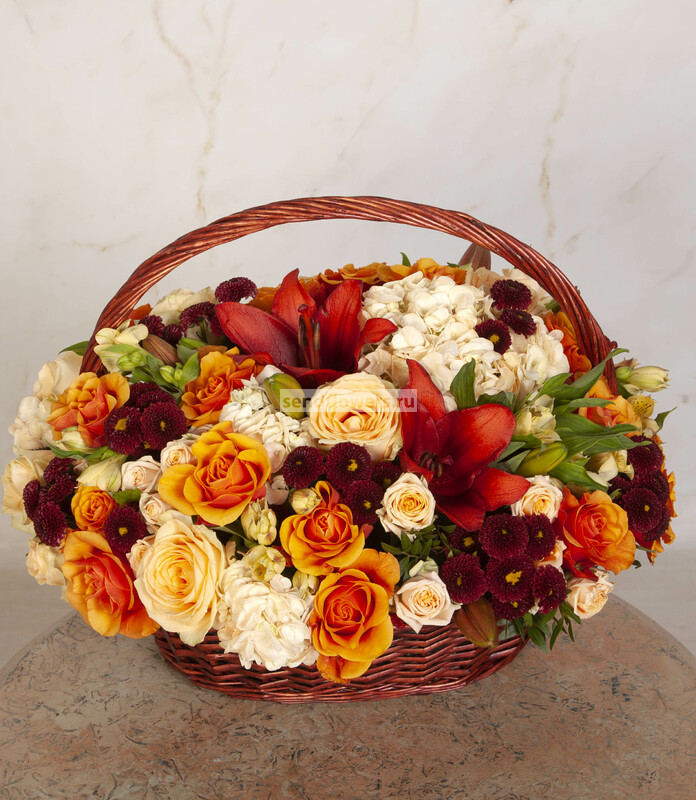 Состав: Корзина большая (1), Оазис кирпич (6), Роза Espana (20), Фисташка (9), Альстромерия желтая (15), Роза кустовая кремовая (15), Роза кремовая (15), Лилия азиатская красная (6), Хризантема Сантини красная (14), Гортензия кремовая СО (3)