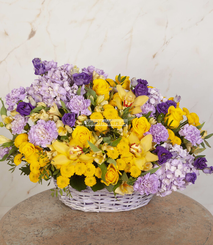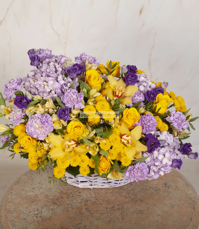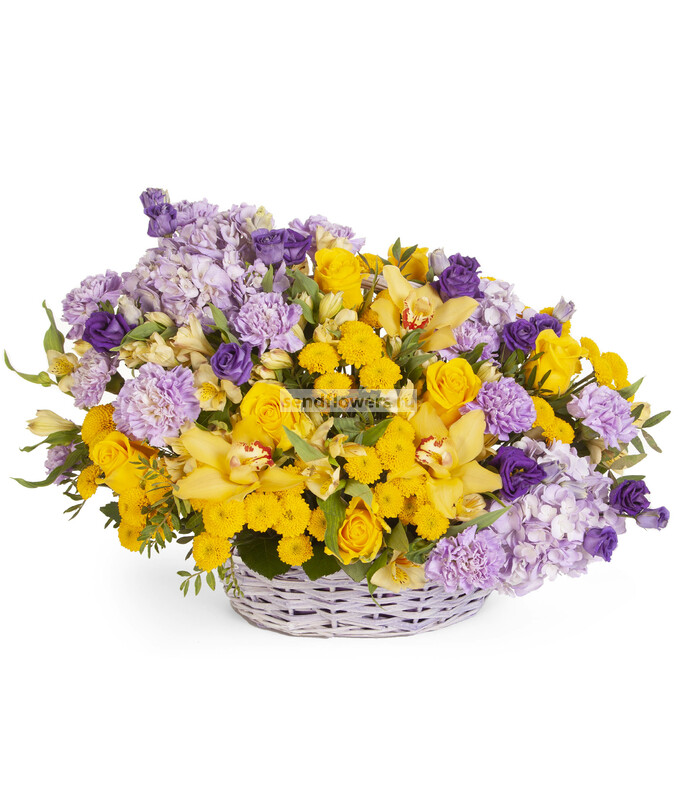 Состав: Роза желтая (5), Оазис кирпич (2), Корзина малая (1), Гвоздика лиловая (10), Фисташка (5), Альстромерия желтая (5), Орхидея Цимбидиум желтый (1), Эустома фиолетовая (3), Хризантема Сантини желтая (5), Гортензия лиловая СО (1)