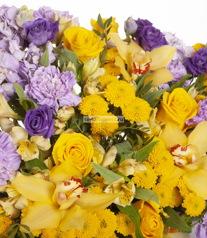 Состав: Роза желтая (15), Оазис кирпич (6), Гвоздика лиловая (20), Фисташка (9), Альстромерия желтая (15), Орхидея Цимбидиум желтый (5), Корзина большая (1), Эустома фиолетовая (7), Хризантема Сантини желтая (15), Гортензия лиловая СО (3)
