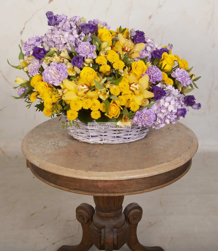 Состав: Корзина средняя (1), Роза желтая (10), Оазис кирпич (4), Гвоздика лиловая (15), Фисташка (7), Альстромерия желтая (10), Орхидея Цимбидиум желтый (3), Эустома фиолетовая (5), Хризантема Сантини желтая (10), Гортензия лиловая СО (2)