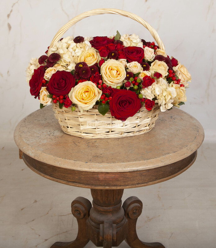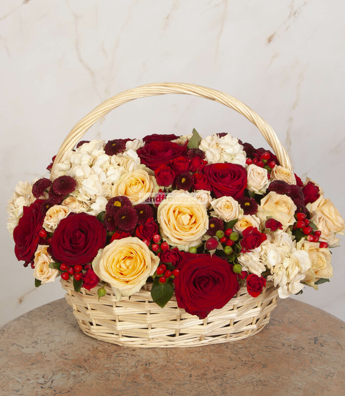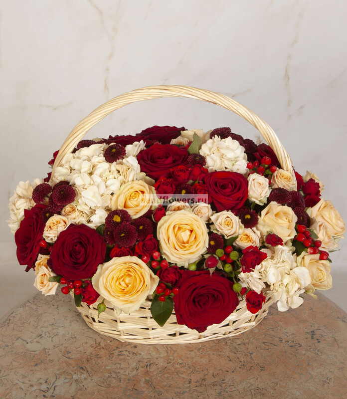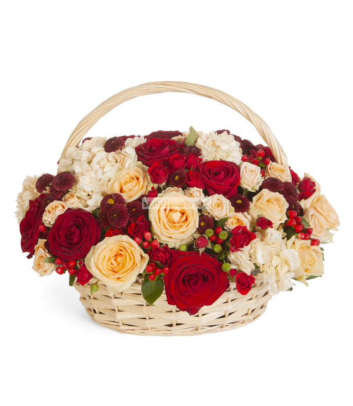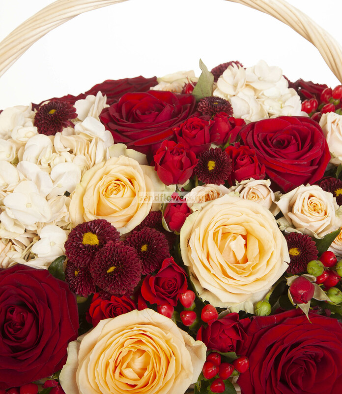 Состав: Корзина большая (1), Гиперикум красный (9), Оазис кирпич (6), Фисташка (9), Роза кустовая кремовая (7), Роза Гран При (20), Роза кремовая (15), Роза кустовая красная (7), Хризантема Сантини красная (9), Гортензия кремовая СО (3)