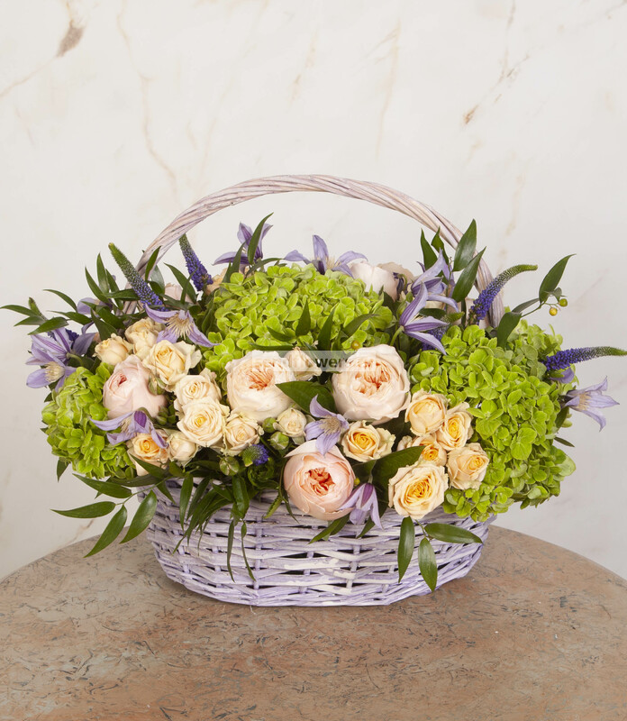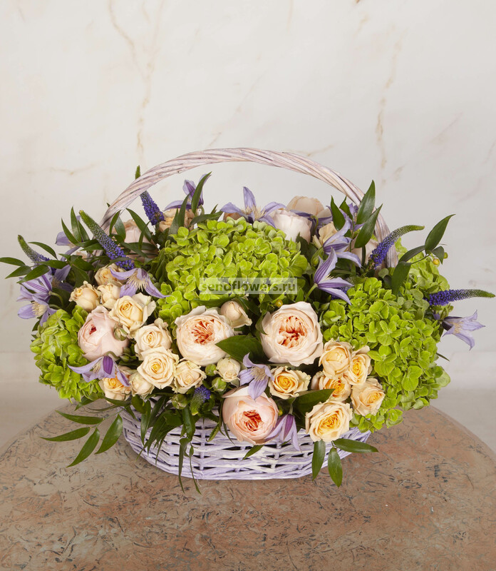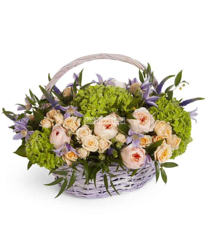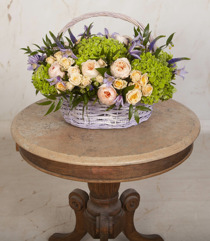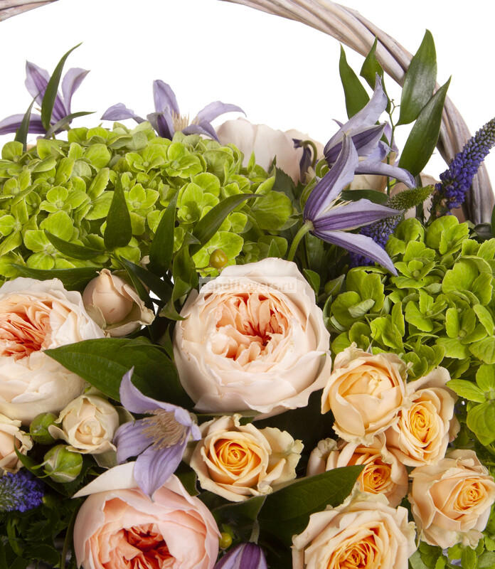 Состав: Корзина средняя (1), Оазис кирпич (4), Клематис (7), Рускус итальянский (2), Фисташка (7), Роза кустовая кремовая (7), Вероника синяя (9), Роза David Austin Juliet (персиковая) (11), Гортензия зеленая СО (5)