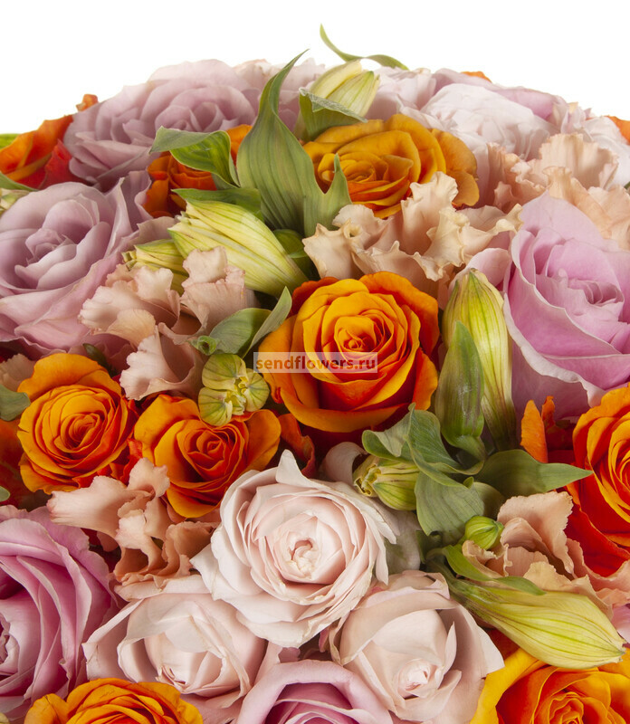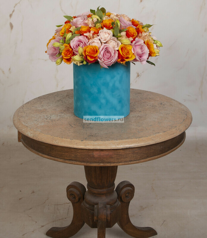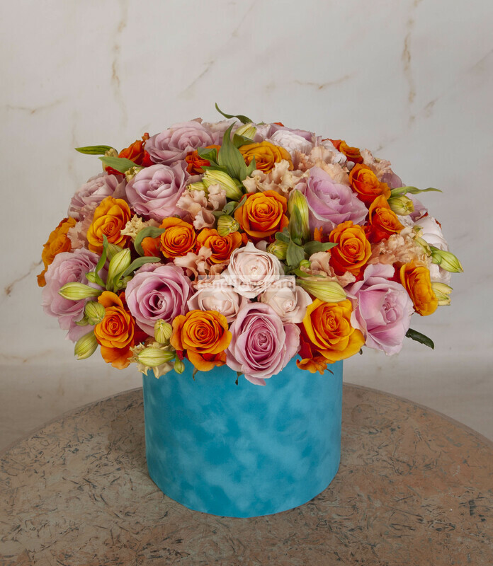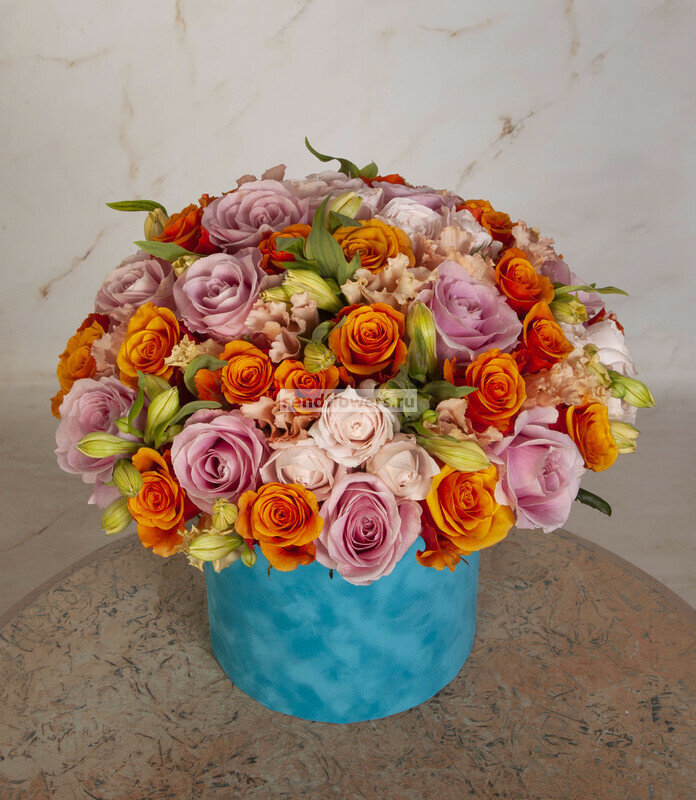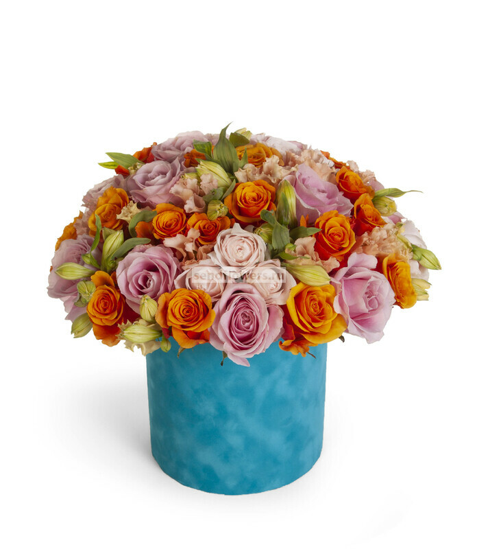 Состав: Оазис кирпич (2), Роза Espana (25), Альстромерия желтая (5), Роза розовая (13), Роза Bombastic (5), Эустома кремовая (4), Коробка бархатная голубая (1)