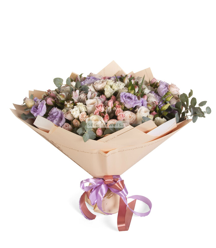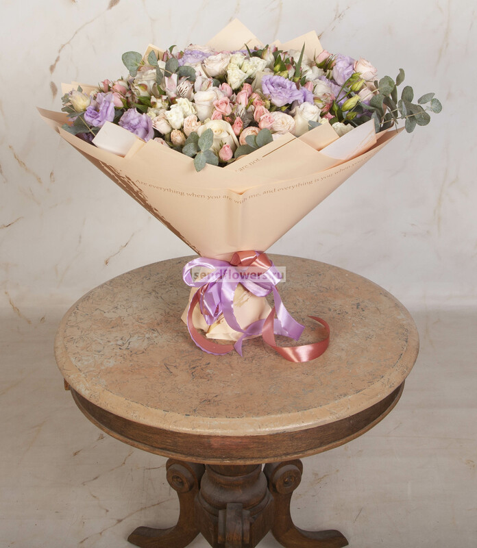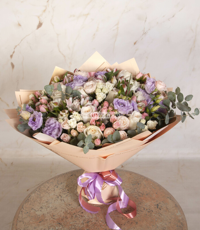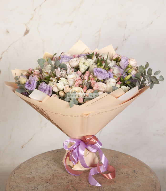 Состав: Эвкалипт (2), Лента натуральная (4), Альстромерия розовая (5), Роза кустовая розовая (5), Роза кустовая белая (8), Эустома сиреневая (6), Роза Bombastic (5), Роза White OHara (7), Пленка матовая (3)