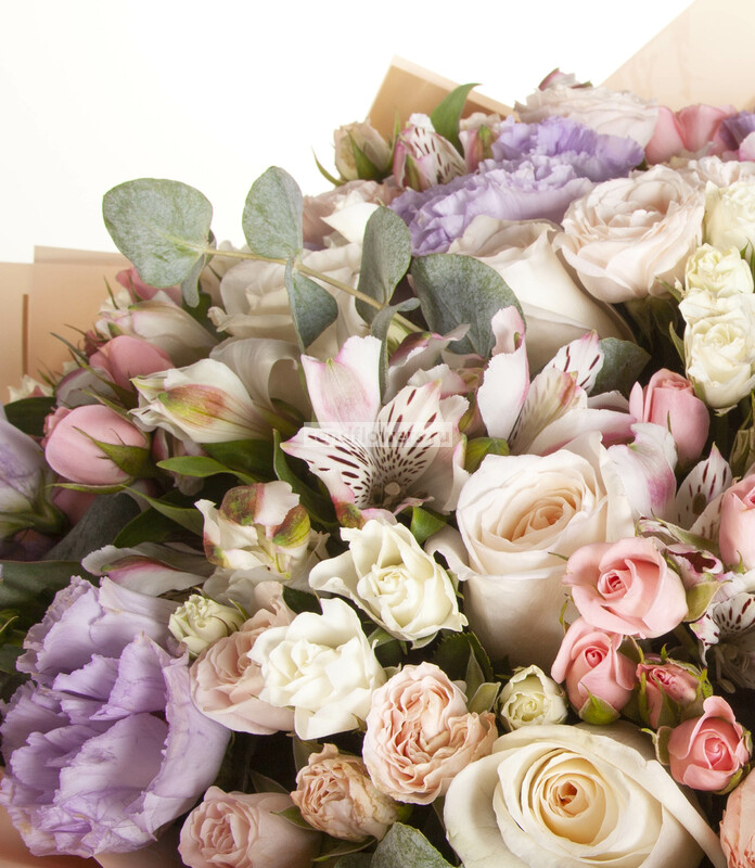 Состав: Эвкалипт (3), Лента натуральная (5), Альстромерия розовая (7), Роза кустовая розовая (7), Роза кустовая белая (10), Эустома сиреневая (8), Роза Bombastic (7), Роза White OHara (9), Пленка матовая (4)