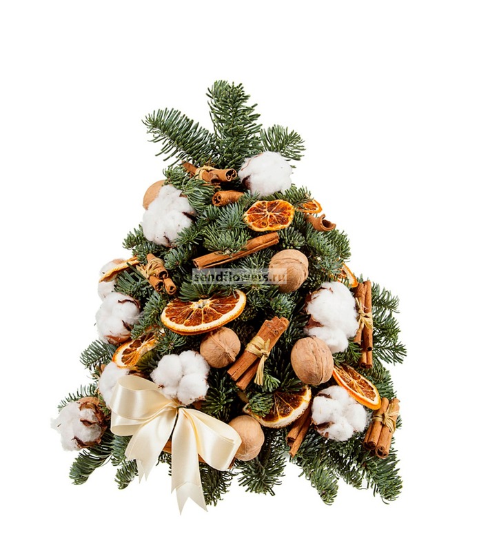 Состав: Оазис кирпич (6), Лапник (5), Лента натуральная (4), Хлопок (20), Кашпо (пластик) (1), Корица (30), Сухофрукты (20), Грецкий орех (20), Лента раффия (5)